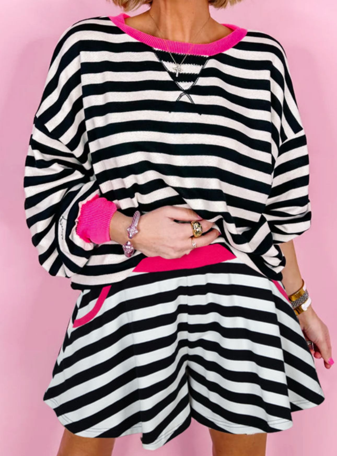 Stripe Contrast Ribbed Banding Long Sleeve Top and Loose Shorts