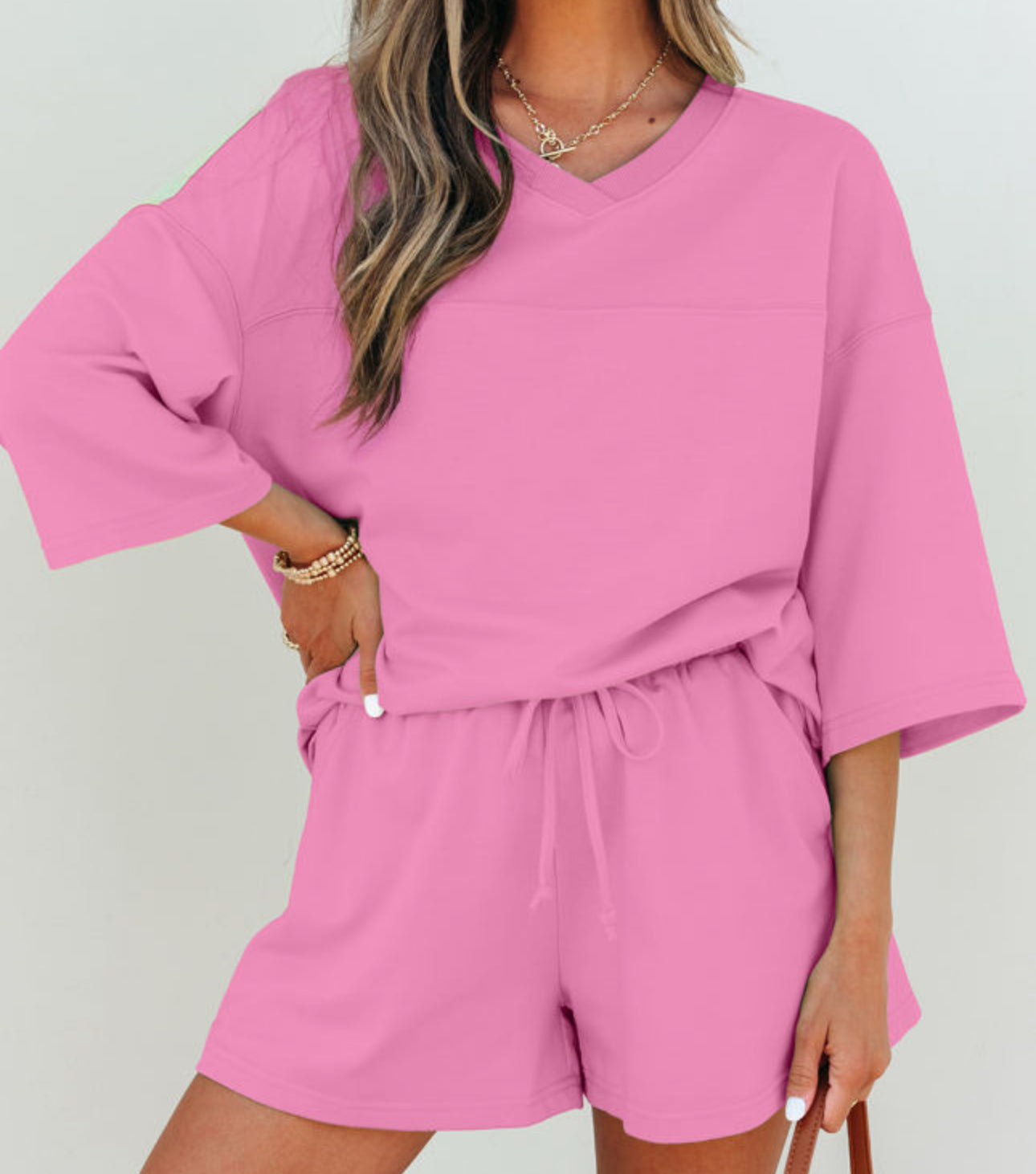 Solid Loose V Neck Half Sleeve Tee and Shorts