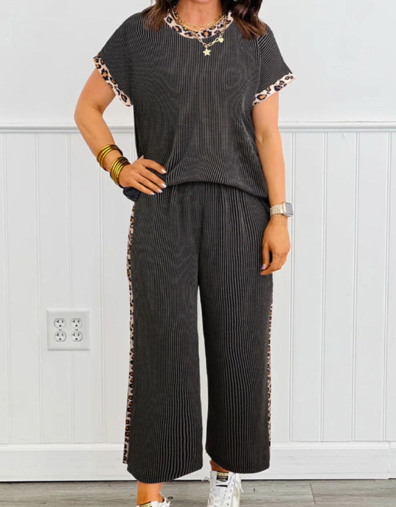 Carbon gray Leopard Patchwork Edge Twisted Rib Tshirt and Cropped Pants set