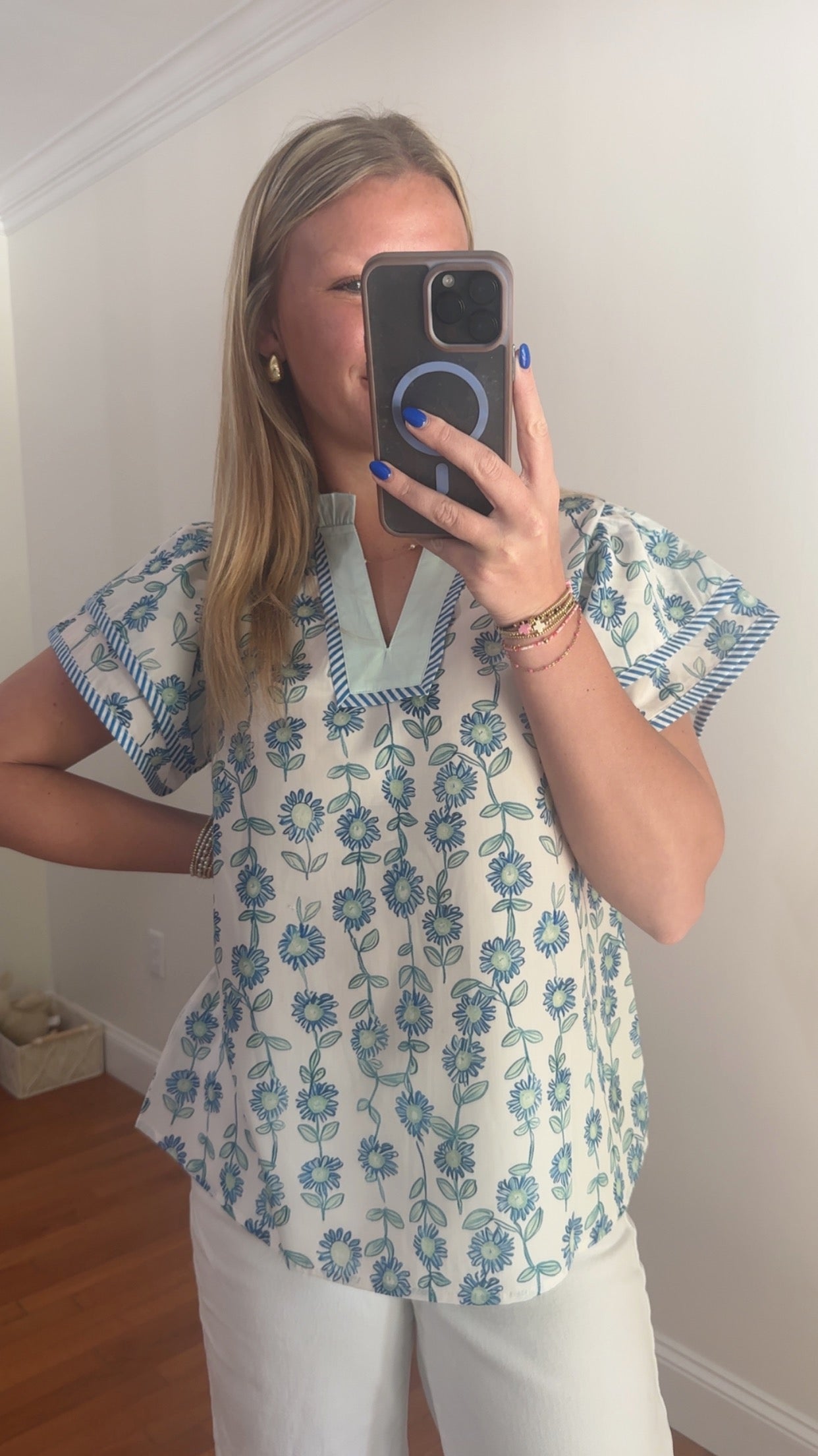 Green Floral Printed Striped Detail Contrast V Neck Patchwork Flutter Sleeve Blouse